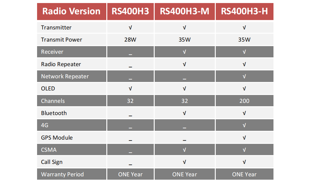 The RS400H3 radio has three versions provides selectivity for the requirement from different users.